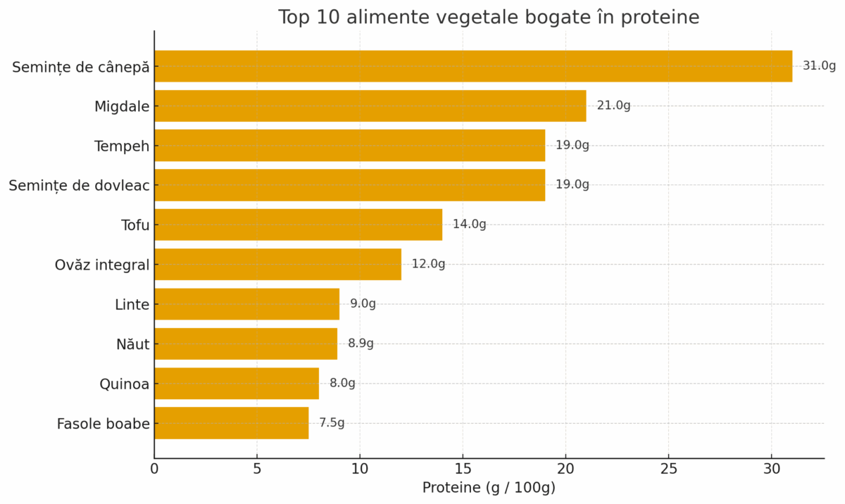 În acest articol îți prezentăm top 10 alimente bogate în proteine vegetale, cu exemple practice și cantitatea de proteină pentru fiecare, ca să-ți construiești mai ușor un meniu echilibrat și hrănitor.